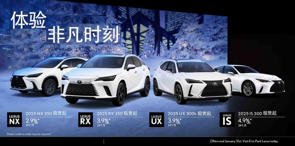 雷克萨斯SUV系列一直以来以卓越的性能、豪华的设计和先进的科技配置受到市场的热烈追捧。在2025年最新推出的雷克萨斯NX 350h、UX 250h、RX 350h三款混合动力车型中,每一款都展现出雷克萨斯品牌对舒适性、节能性和驾驶体验的执着追求。请注意,目前这些车型库存有限,欲购从速,先到先得!请立即预约销售顾问,前往180 Achilles Rd, Ajax, ON L1S 7S3,亲自体验雷克萨斯SUV的卓越魅力。