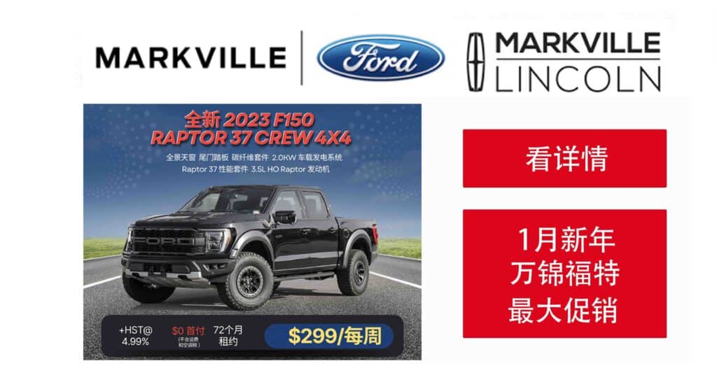 Markville Ford Lincoln新年大促,精选福特SVT车型限时优惠,包括Mustang Cobra、Lightning、Raptor、Focus等经典高性能车系。购车享免费首年保养和低首付方案。立即预约试驾,地址:4600 Hwy 7, Markham, ON L3R 1M5,库存有限,先到先得